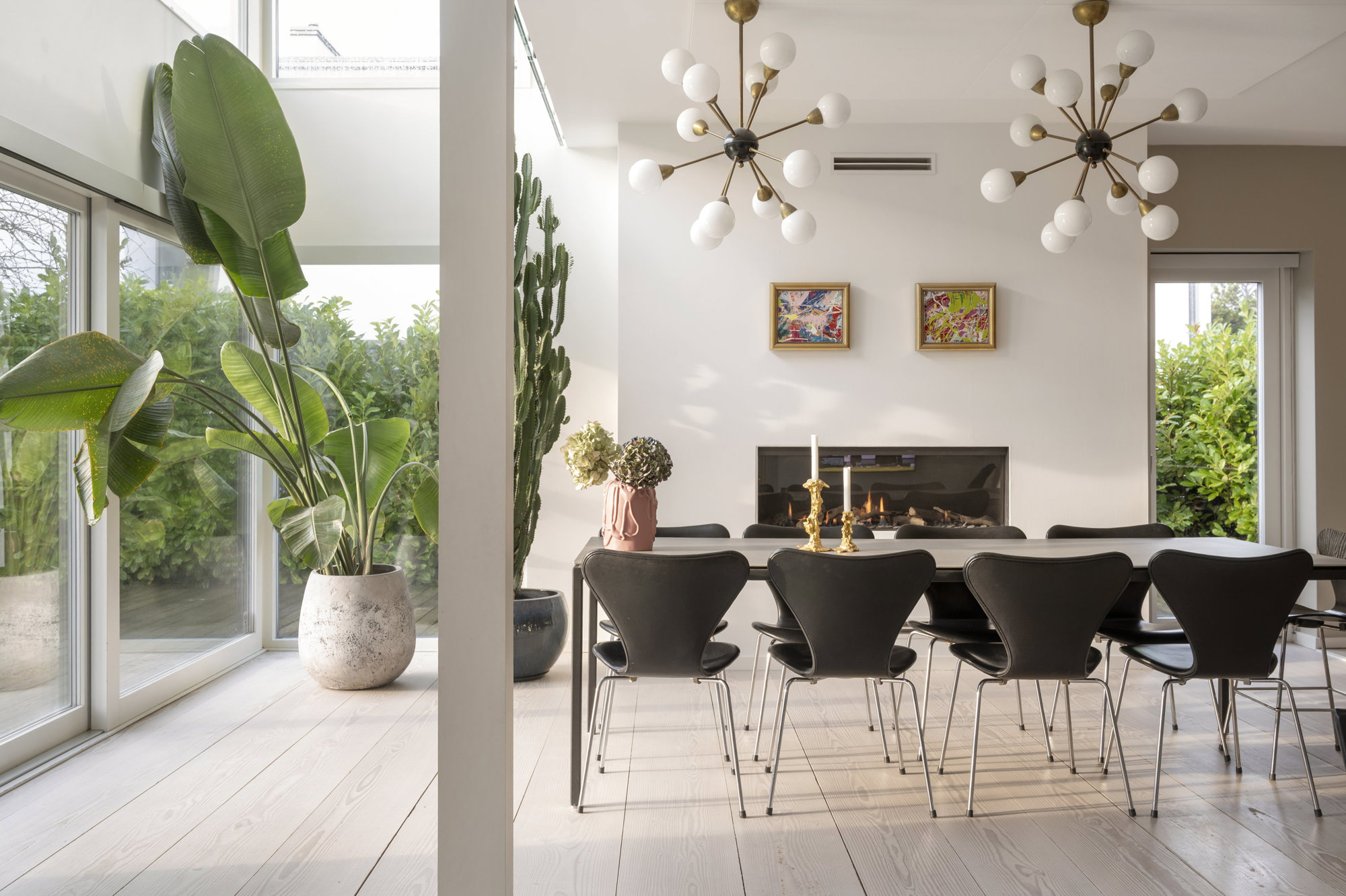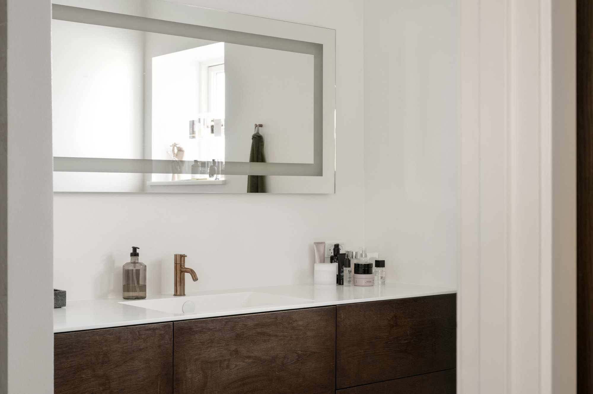 Her, midt mellem 'vedbæk og Skodsborg, på gammelt slotsterræn, startede man forfra i 2015 og byggede en moderne, kompromisløs villa med fokus på materialer, proportioner og rumlighed. Foruden 275 boligkvadratmeter – med varme under Dinesen-plankegulvene – er der 109 kvadratmeter underetage og 42 kvadratmeter garage (der i dag fungerer som aktivitetsrum for børn i alle aldre.