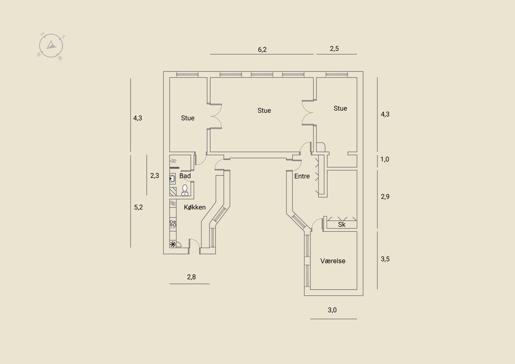 Lejligheden indeholder større rummelig entré med flere skabe. Herfra er der adgang til et åbent walk-in som også kan benytttes til opbevaring. Her er 2 gode soveværelser hvoraf det ene har åben adgang til mindre rum som er oplagt at bruge til walk-in dressing værelse. To smukke stuer en-suite med den skønneste belysning og med et loft som synes som et maleri. Stuerne kan lukkes af med de smukke dobbeltdøre.