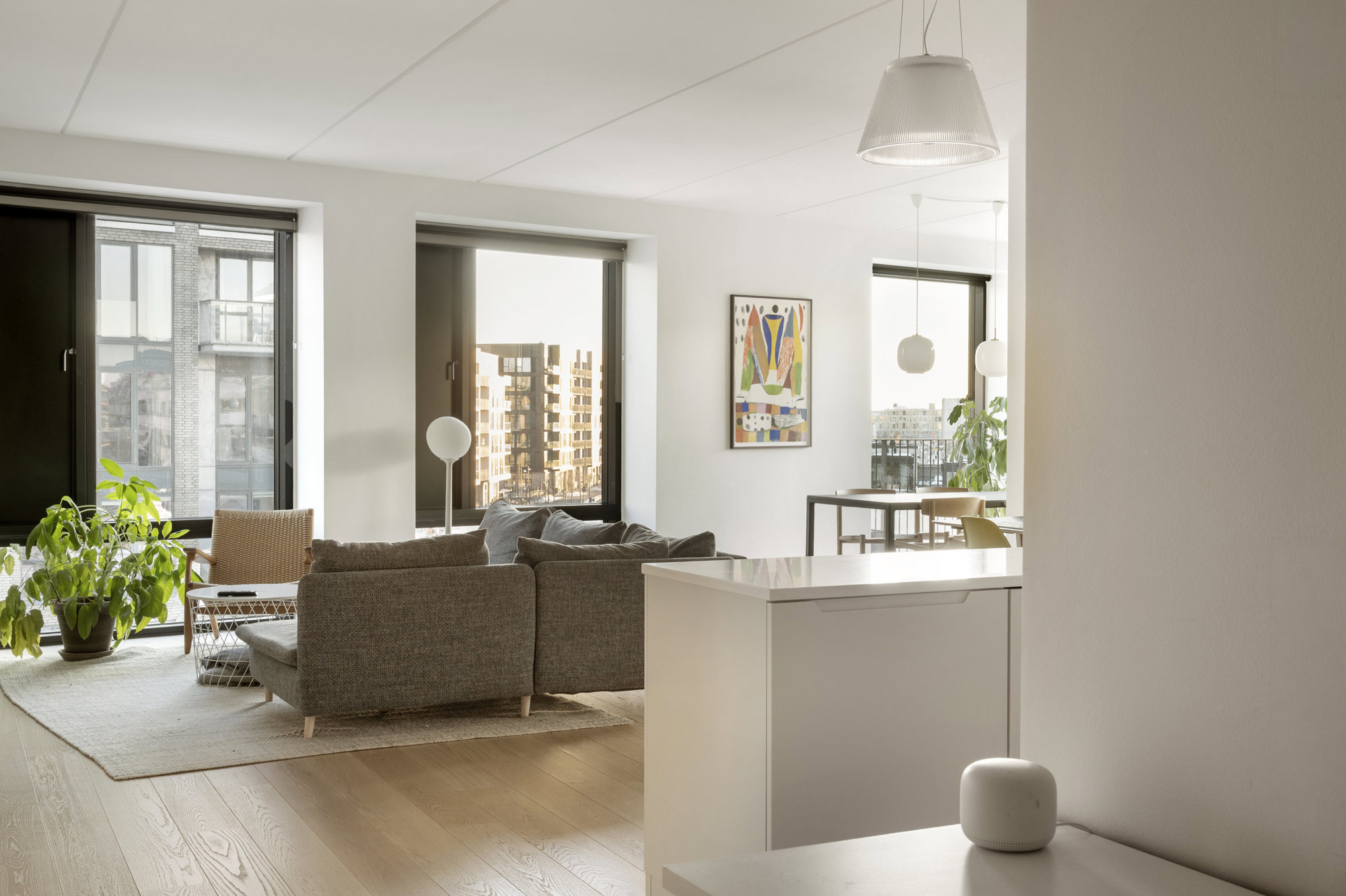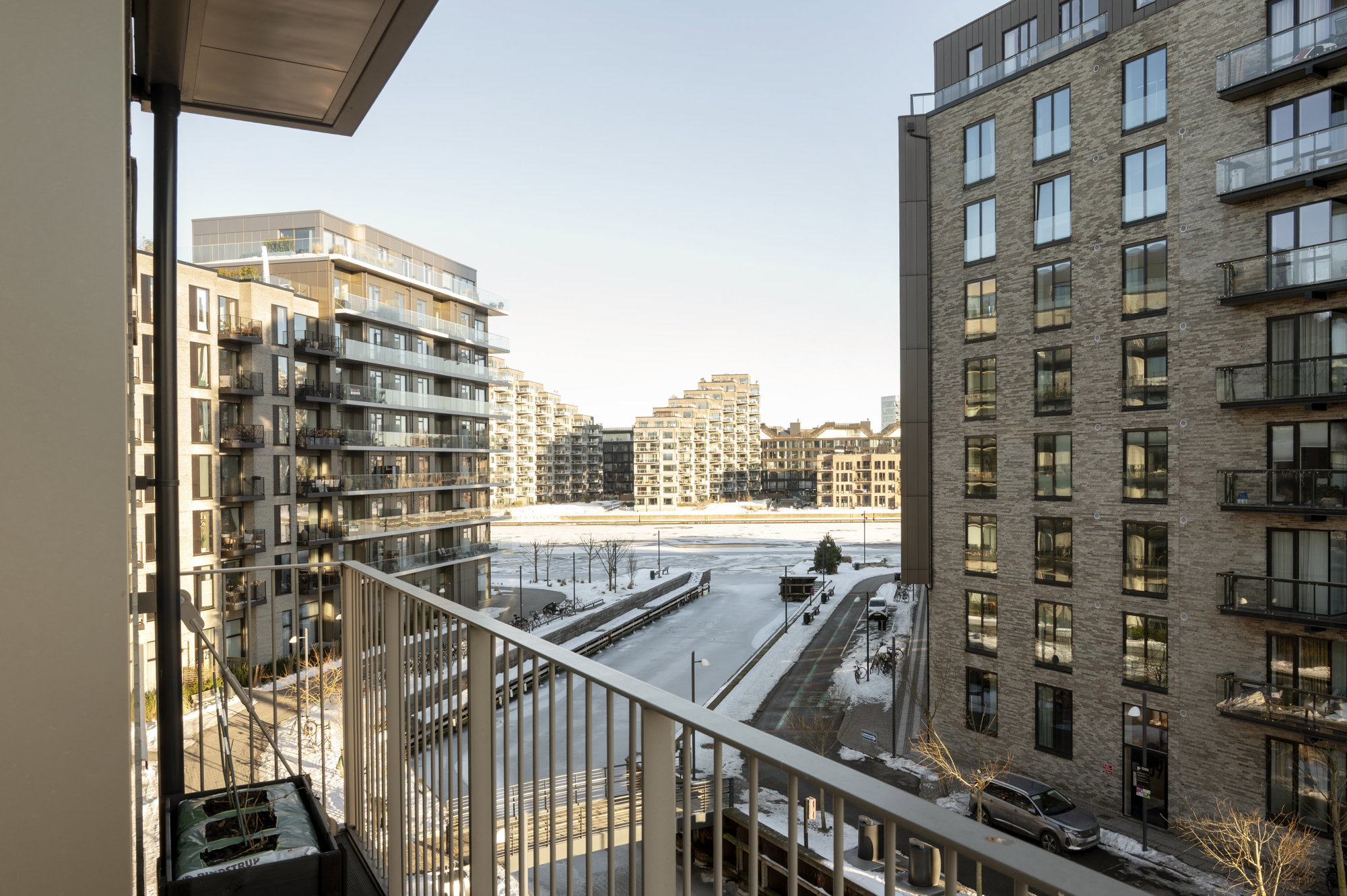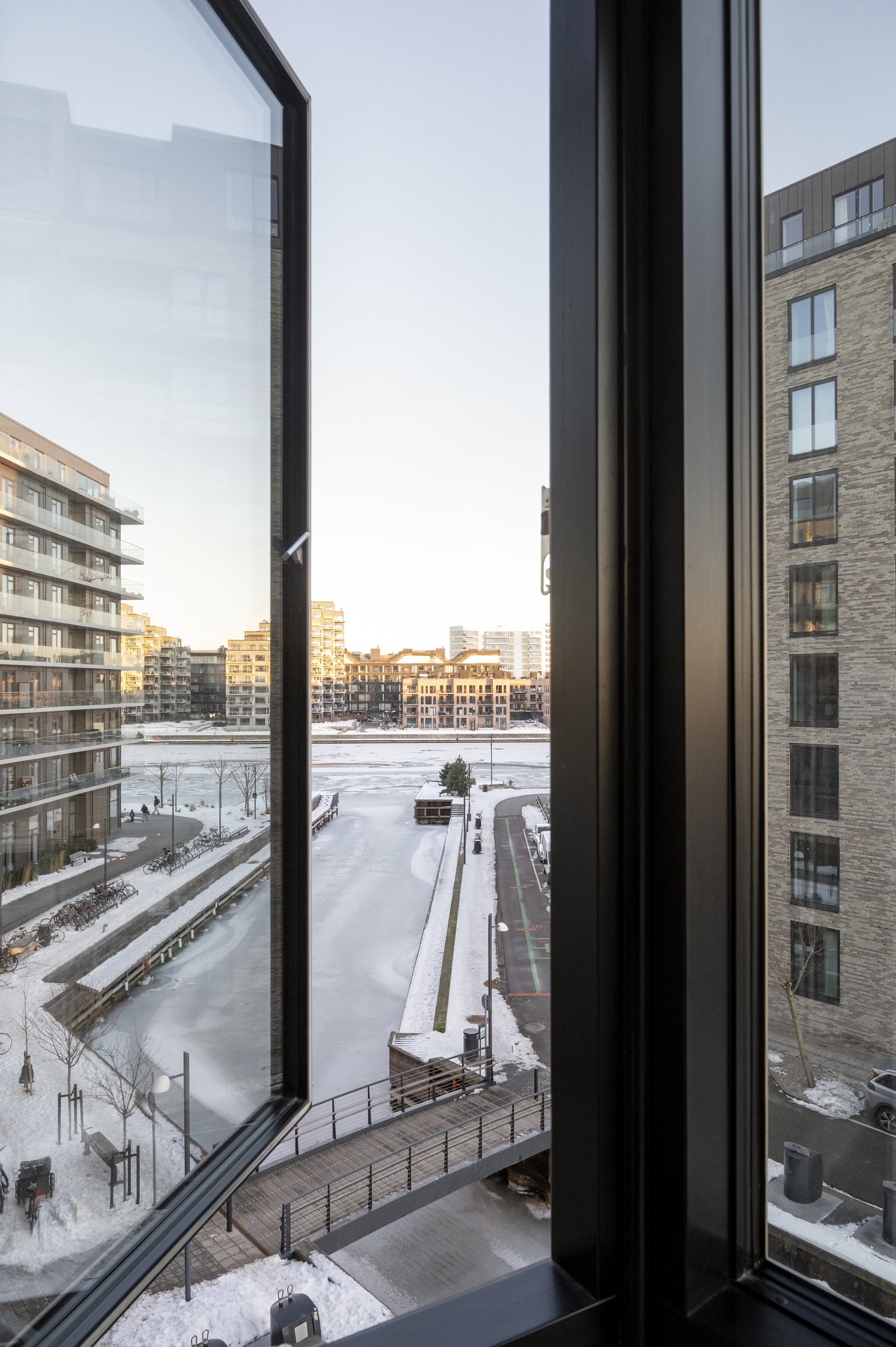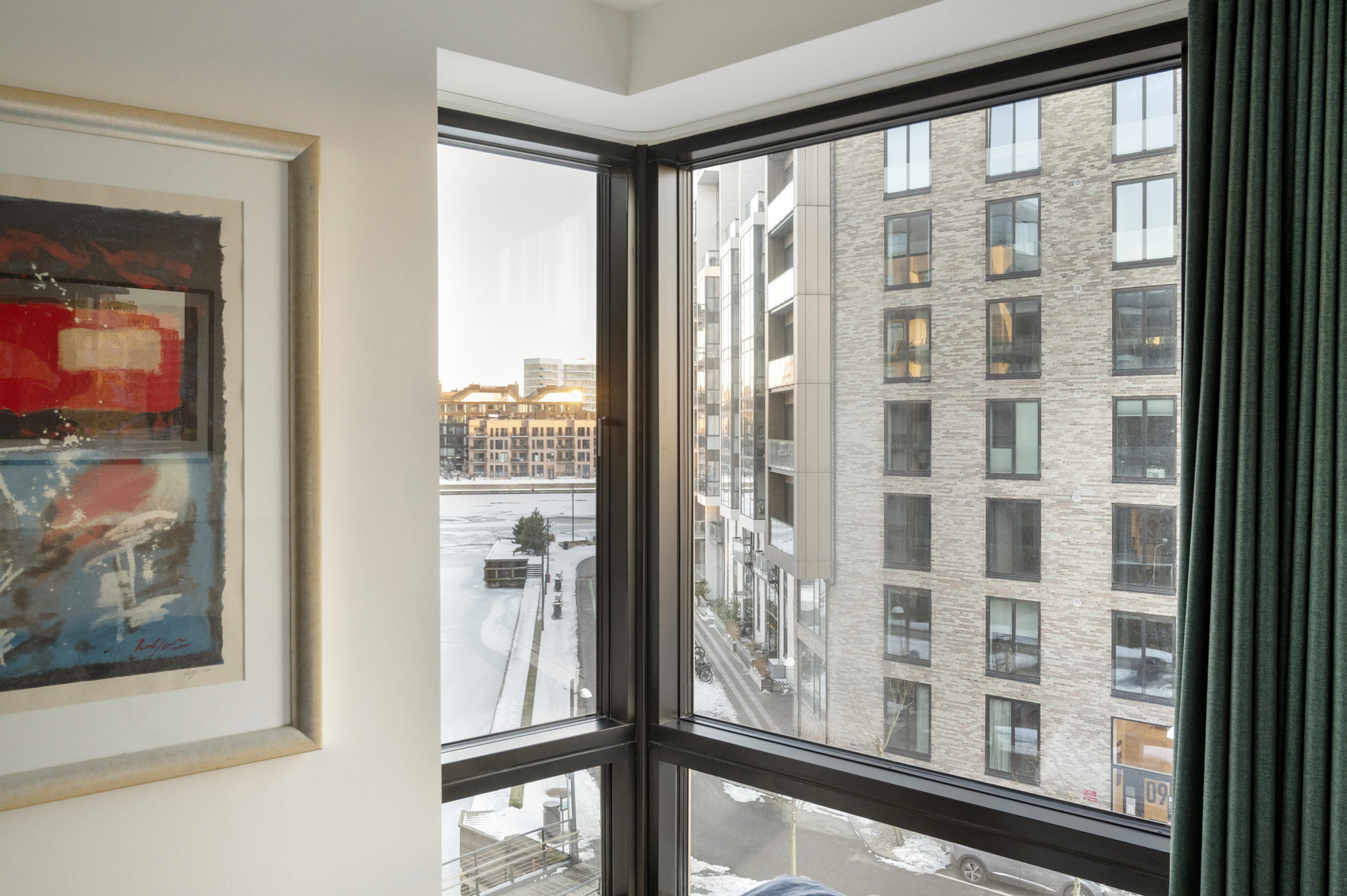 På tredje sal, med 149 kvadratmeter strakt ud mod vandet, er udsigt ikke noget, man opsøger. Den opsøger én. Fra alle vinduer. Solen står op over Islands Brygge og rammer soveværelset uden at banke på. Midt på dagen glider den ind i stuen, og om aftenen synker den ned bag Vesterbro, mens kajakker skærer sig gennem vandet nedenfor. Fra alle vinduer er der frit udsyn over havneløbet, hvor krusningerne på vandet spejler sig, og hvor himlen synes større end andre steder i byen. Planløsningen er intuitiv og velfungerende – én afdeling til de voksne med walk-in og eget bad, én til børnene. Og midt imellem et stort, samlende køkken-alrum og stue, hvor livet kan leves uden spildplads eller støj. Alt er nyt, velholdt og klar til at blive taget i brug.