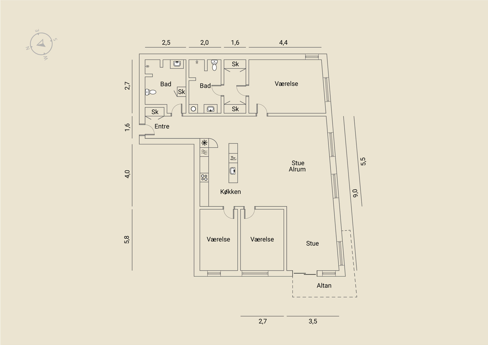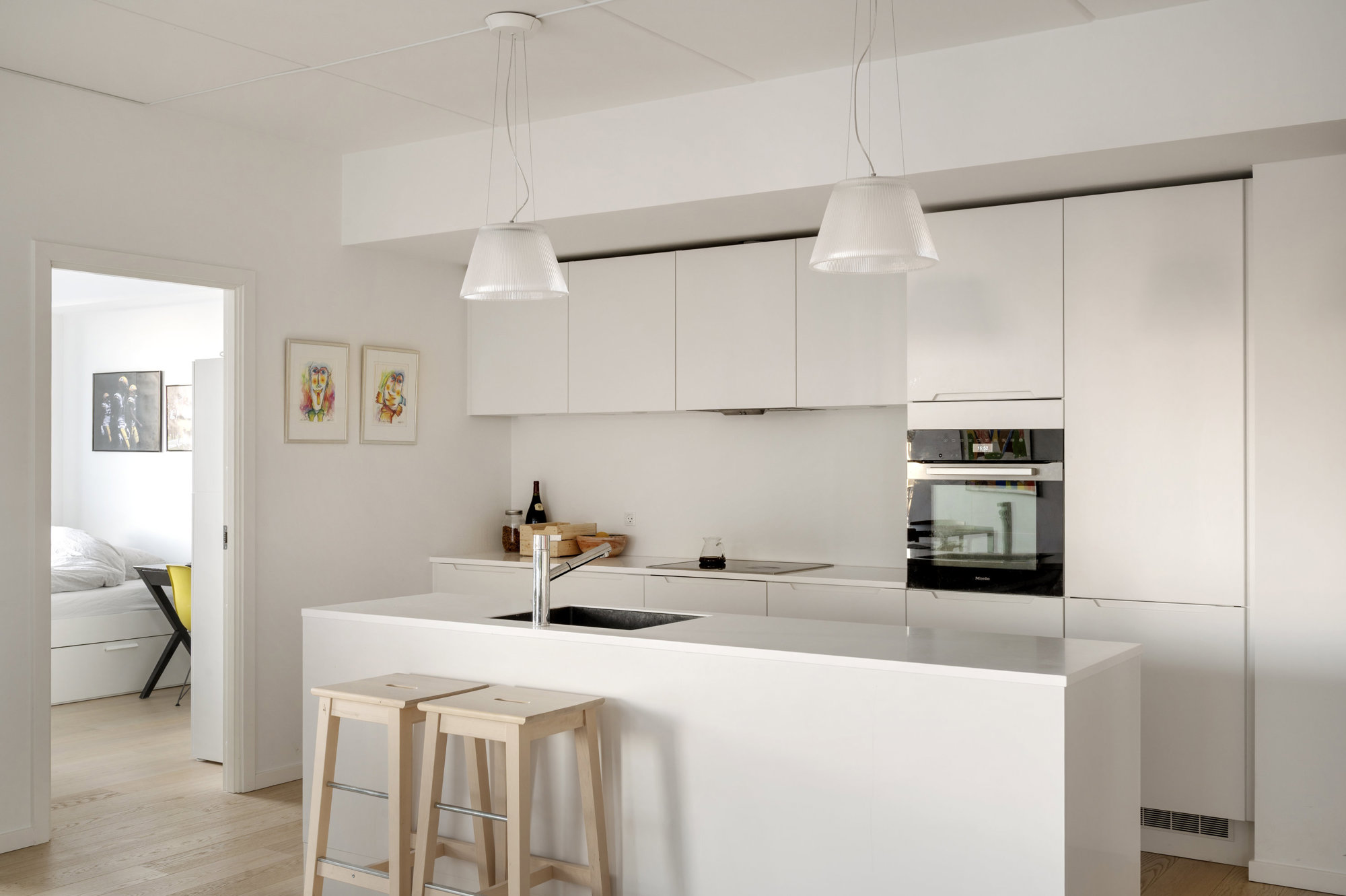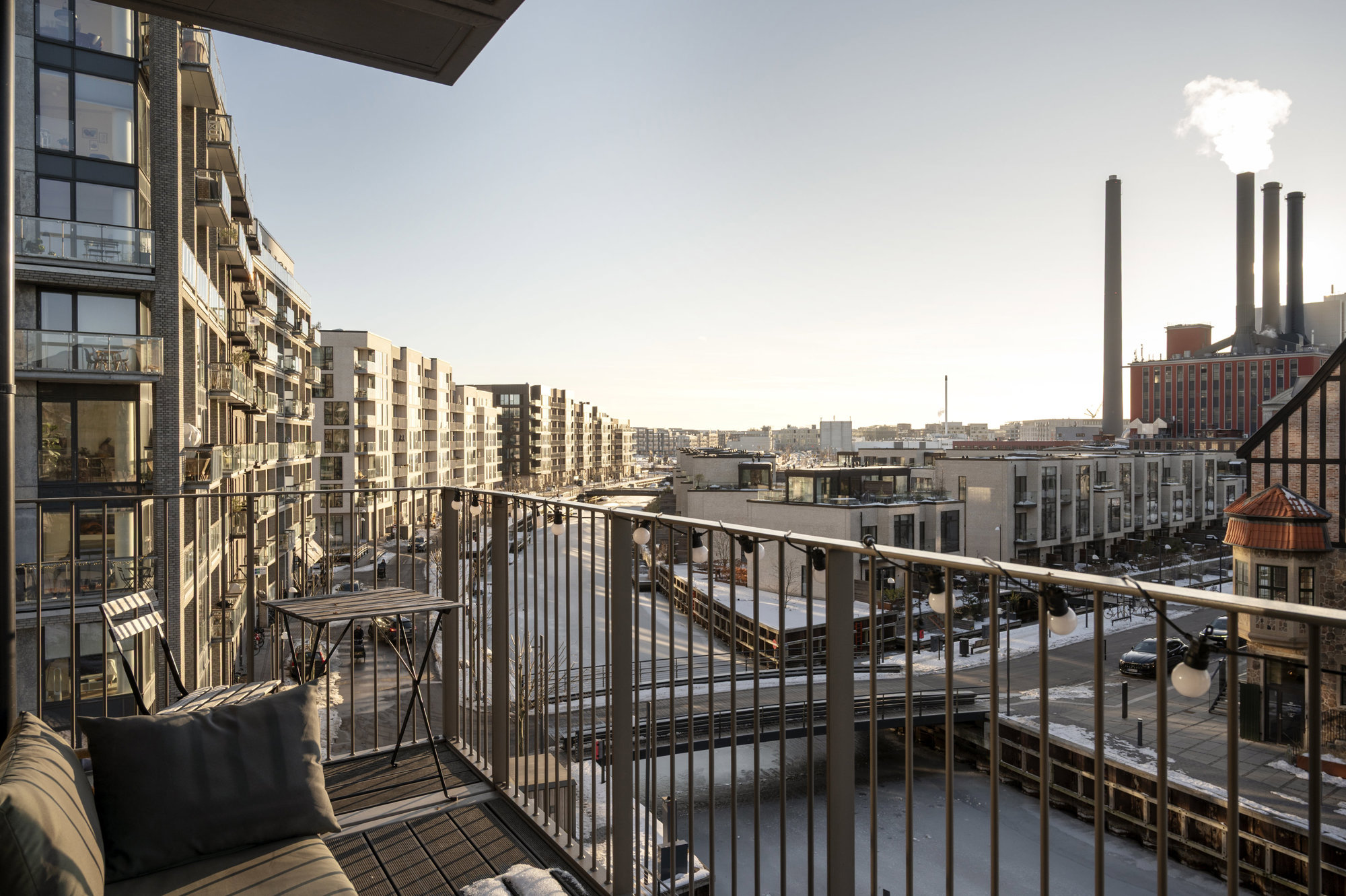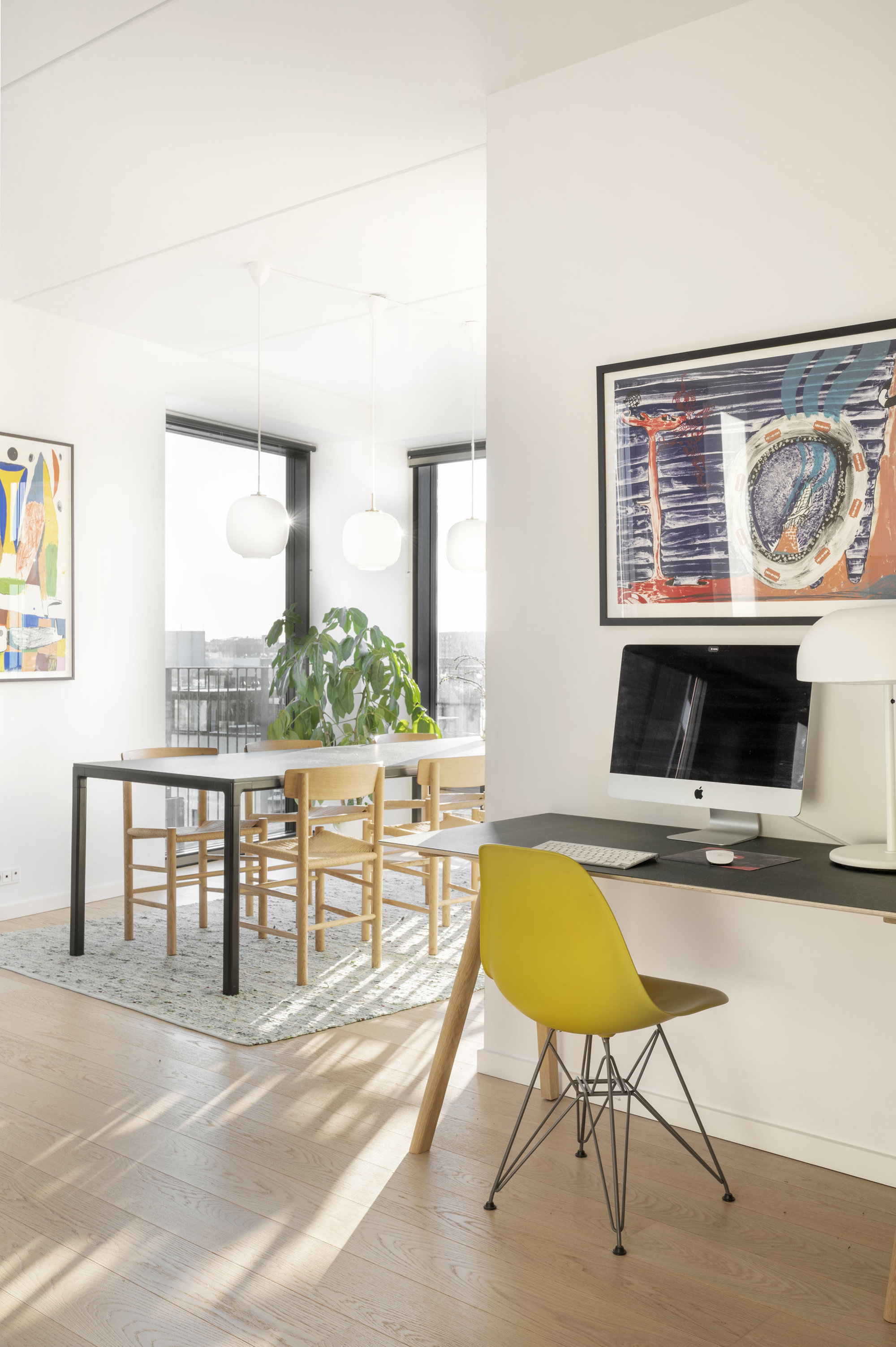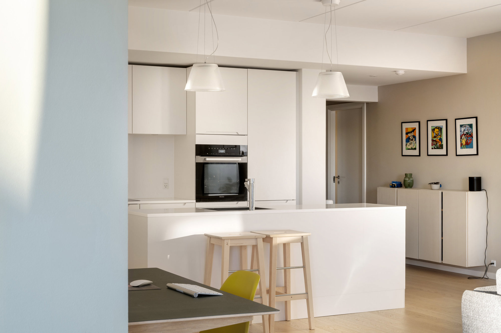 På tredje sal, med 149 kvadratmeter strakt ud mod vandet, er udsigt ikke noget, man opsøger. Den opsøger én. Fra alle vinduer. Solen står op over Islands Brygge og rammer soveværelset uden at banke på. Midt på dagen glider den ind i stuen, og om aftenen synker den ned bag Vesterbro, mens kajakker skærer sig gennem vandet nedenfor. Fra alle vinduer er der frit udsyn over havneløbet, hvor krusningerne på vandet spejler sig, og hvor himlen synes større end andre steder i byen. Planløsningen er intuitiv og velfungerende – én afdeling til de voksne med walk-in og eget bad, én til børnene. Og midt imellem et stort, samlende køkken-alrum og stue, hvor livet kan leves uden spildplads eller støj. Alt er nyt, velholdt og klar til at blive taget i brug.