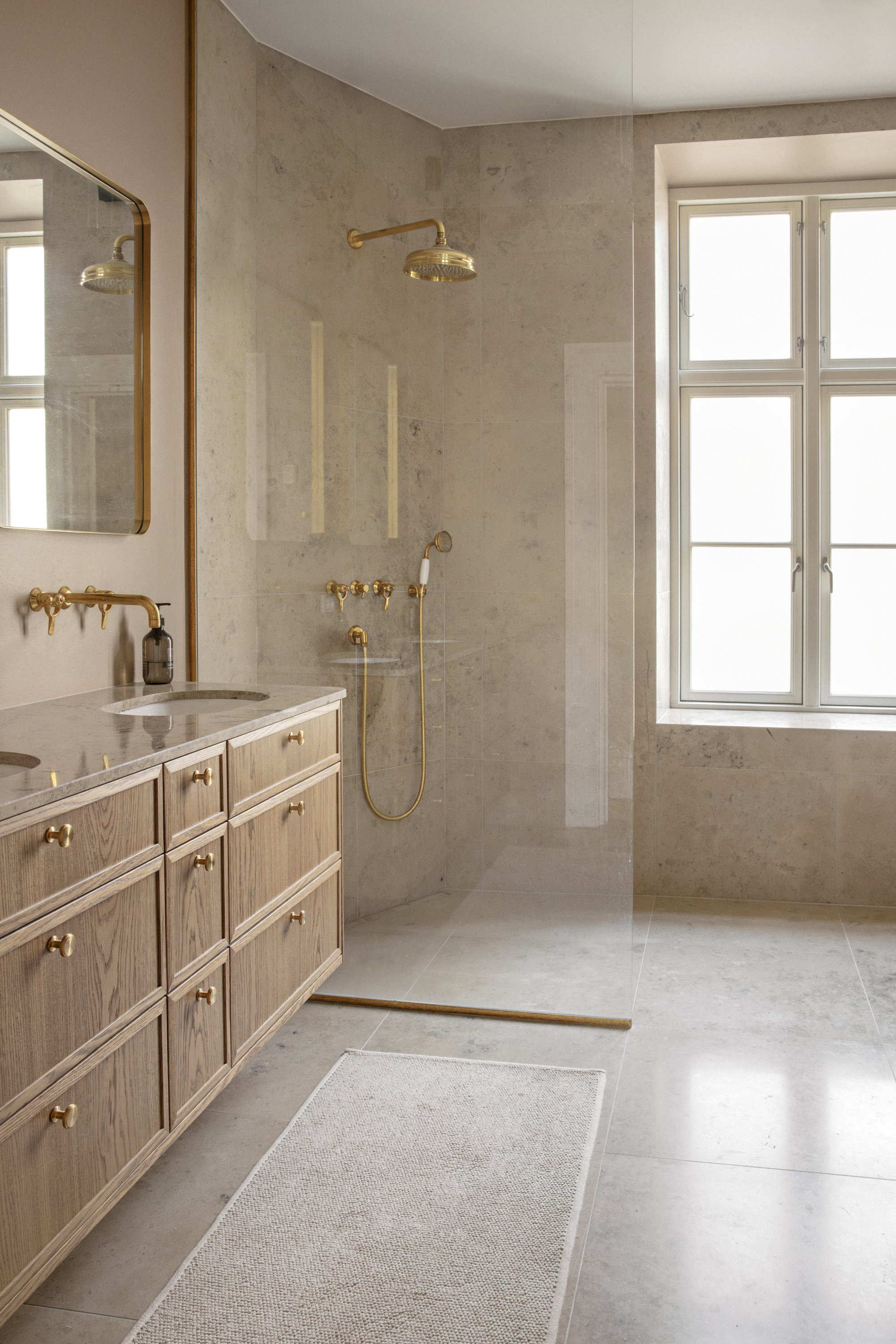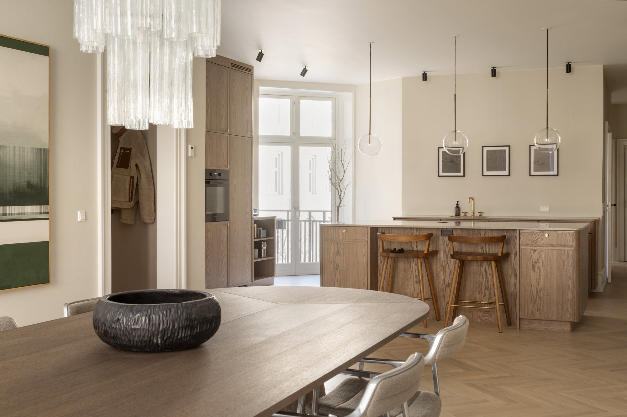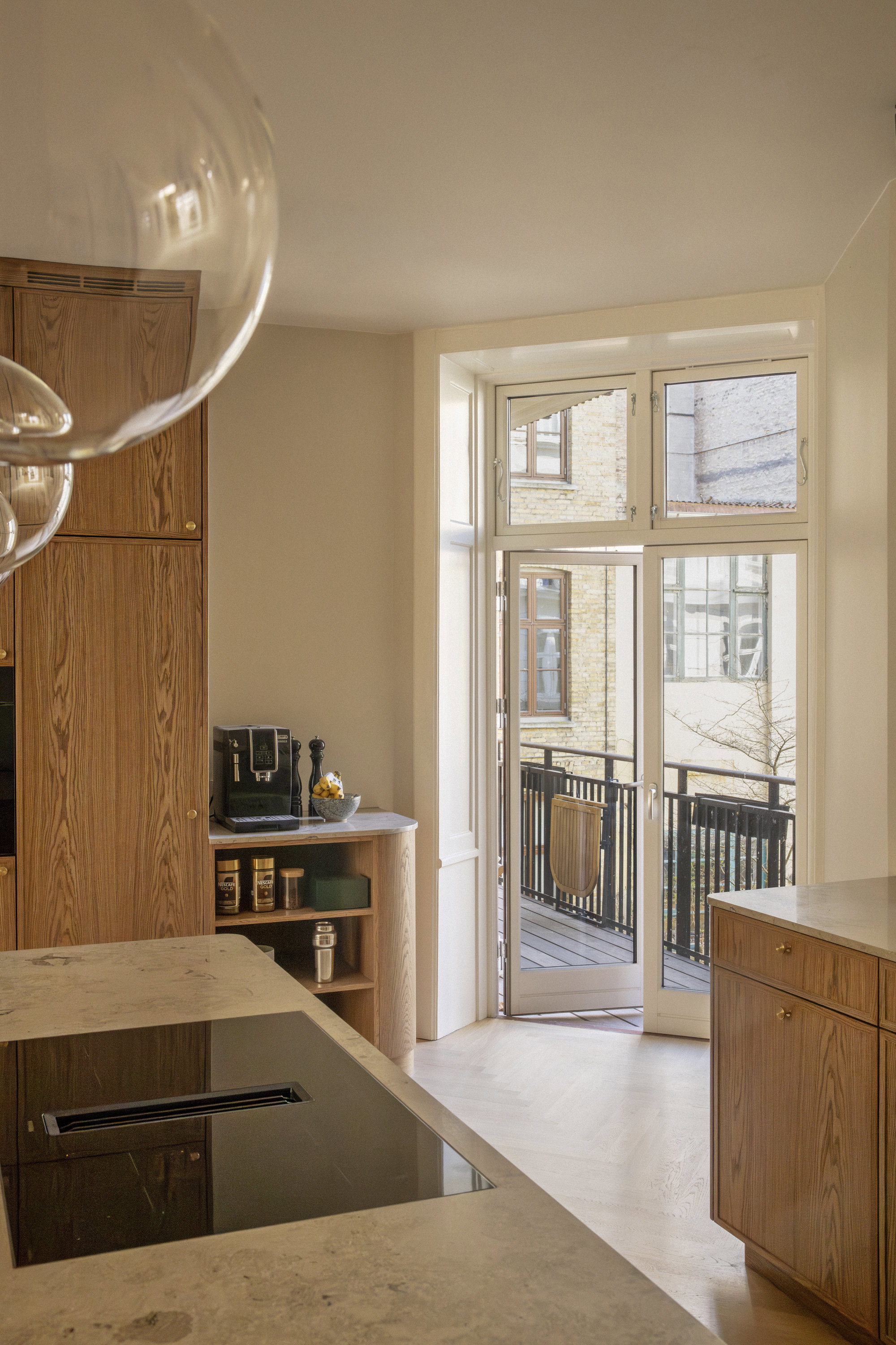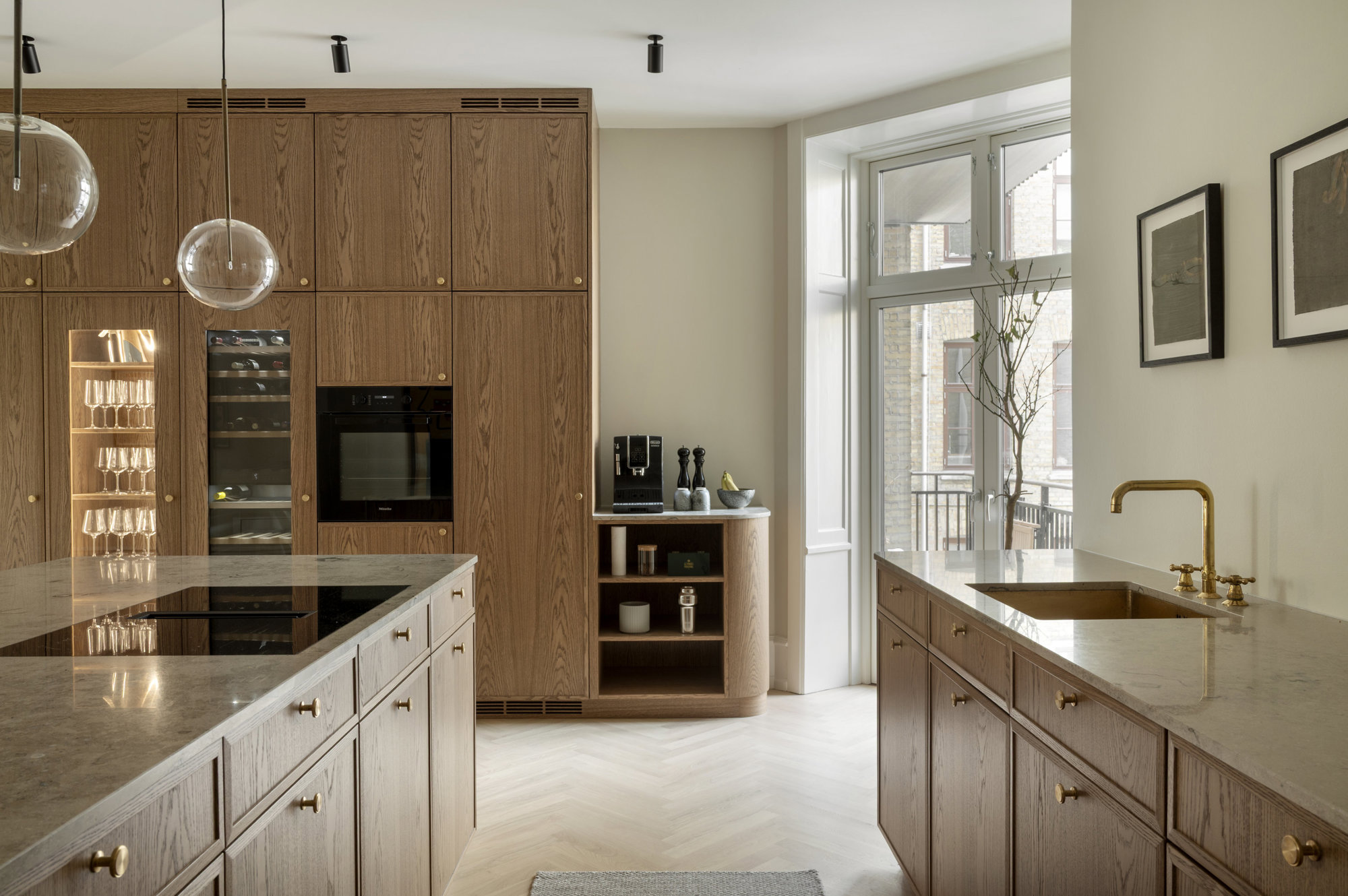 På første sal – ejendommens beletage, der ofte var forbeholdt bygherren – breder en herskabslejlighed sig over 194 kvadratmeter. Her er himmelhøjt til loftet, og hver en flade er restaureret med respekt for arkitekturen og en klar forståelse for, hvad der klæder en bolig fra 1893. Køkken-alrummet er lejlighedens nerve, det er stort og åbent med udgang til altan, og de tre stuer ligger en suite, som de skal. Rum, der kan forbindes eller adskilles efter behov. Her er volumen og fleksibilitet. Plads til hverdagen og det, der bryder den. Derudover rummer boligen to store værelser, hvoraf det ene har separat indgang fra bagtrappen – ideelt til teenagere med sene sengetider. En detalje fra en tid med herskab og tjenestefolk, der i dag viser sig overraskende anvendelig. Materialerne – eg, marmor, ubehandlet messing – er valgt med omtanke og uden kompromiser. Og ser også smukt ud om 50 år.