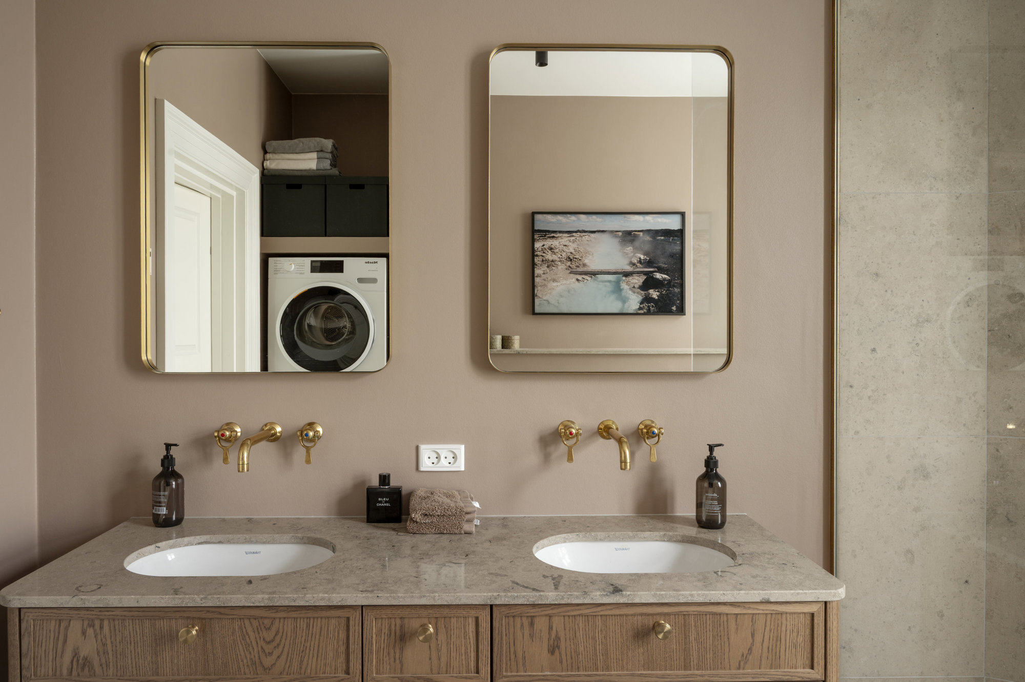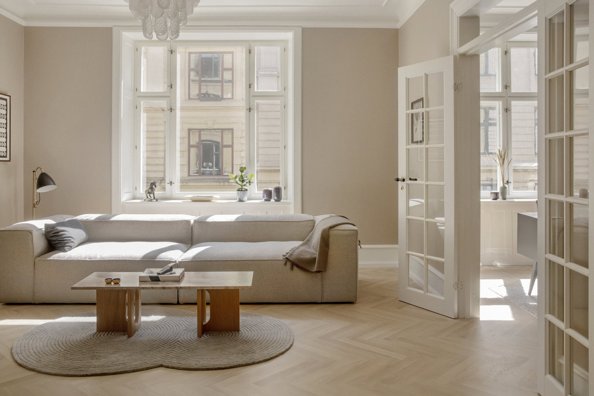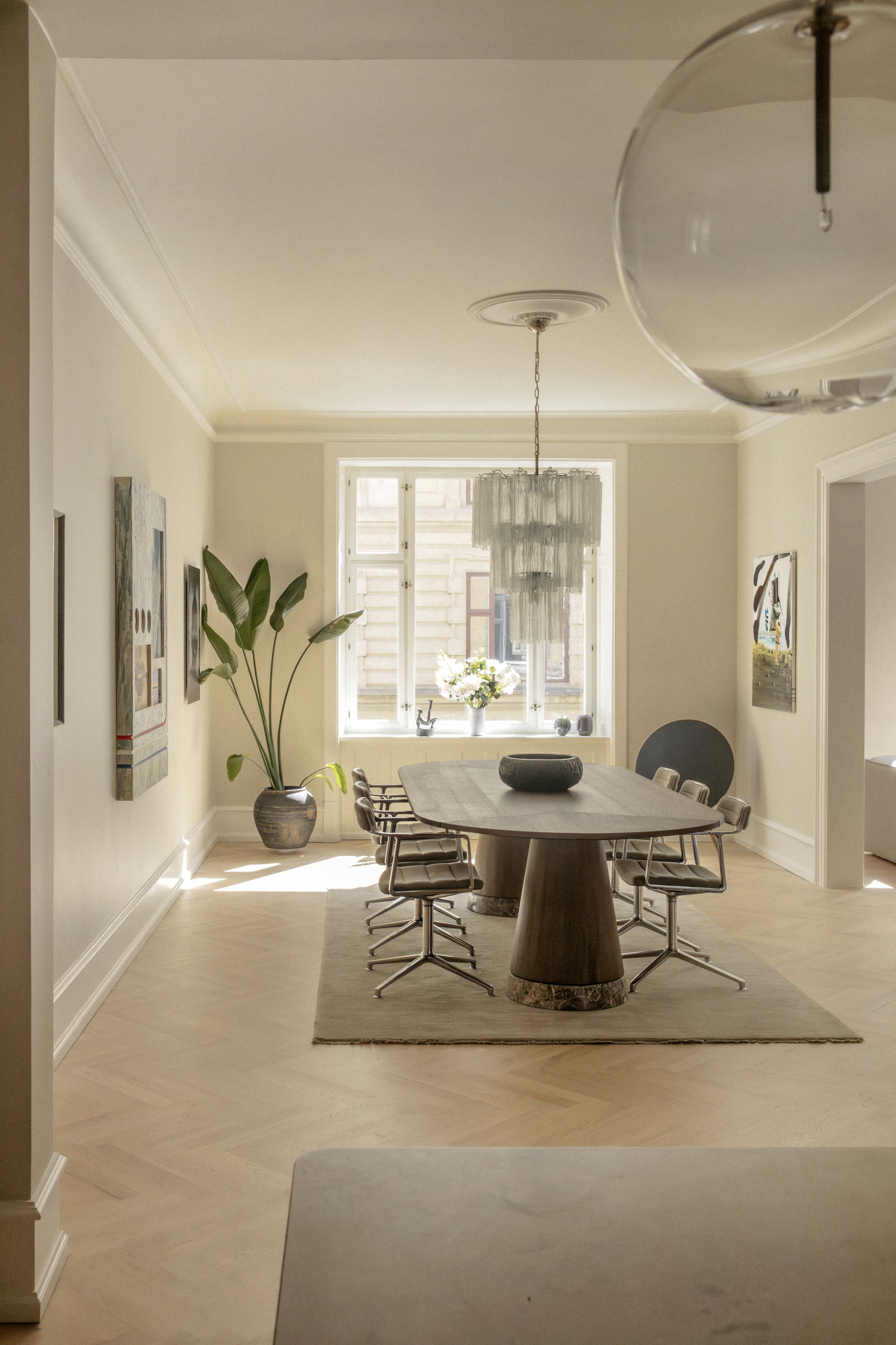 På første sal – ejendommens beletage, der ofte var forbeholdt bygherren – breder en herskabslejlighed sig over 194 kvadratmeter. Her er himmelhøjt til loftet, og hver en flade er restaureret med respekt for arkitekturen og en klar forståelse for, hvad der klæder en bolig fra 1893. Køkken-alrummet er lejlighedens nerve, det er stort og åbent med udgang til altan, og de tre stuer ligger en suite, som de skal. Rum, der kan forbindes eller adskilles efter behov. Her er volumen og fleksibilitet. Plads til hverdagen og det, der bryder den. Derudover rummer boligen to store værelser, hvoraf det ene har separat indgang fra bagtrappen – ideelt til teenagere med sene sengetider. En detalje fra en tid med herskab og tjenestefolk, der i dag viser sig overraskende anvendelig. Materialerne – eg, marmor, ubehandlet messing – er valgt med omtanke og uden kompromiser. Og ser også smukt ud om 50 år.