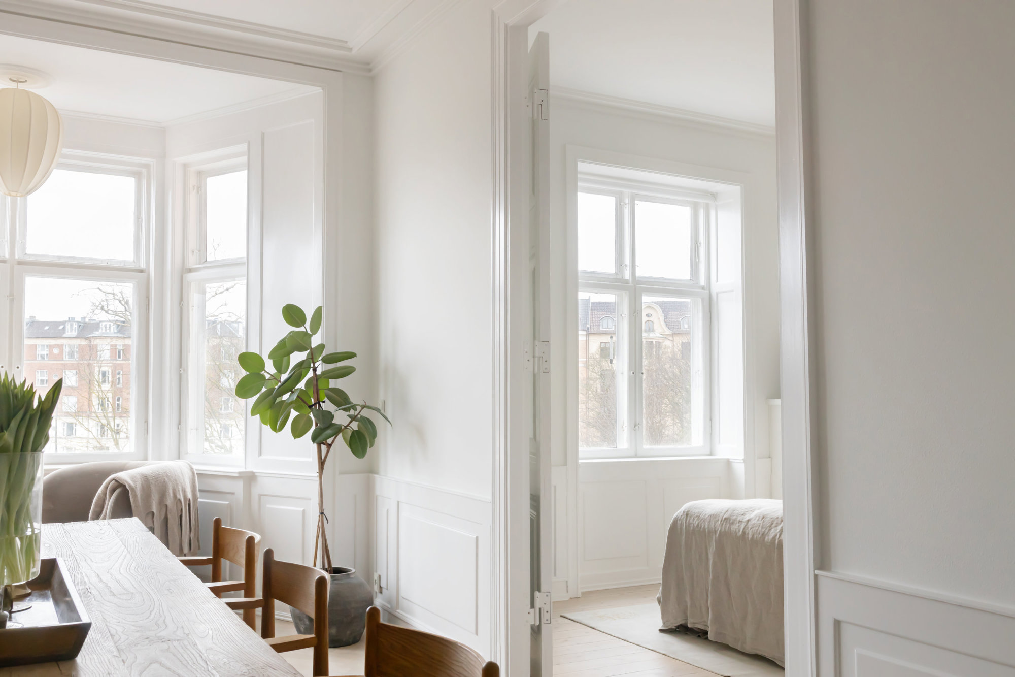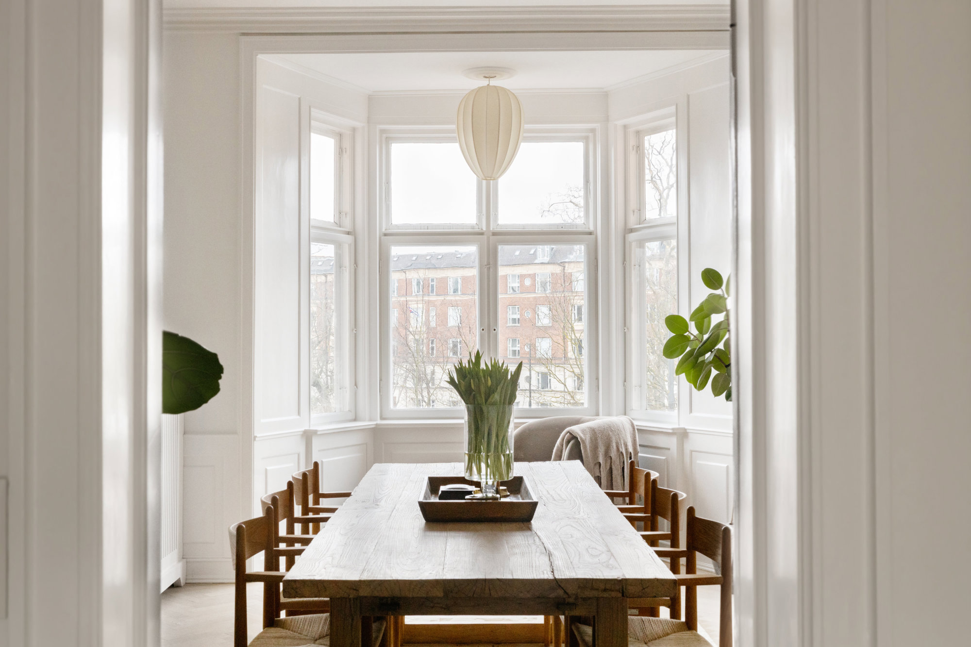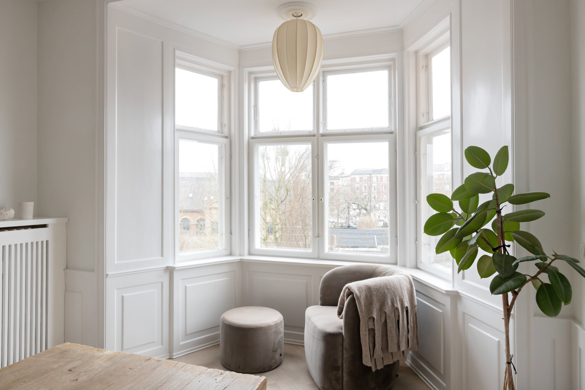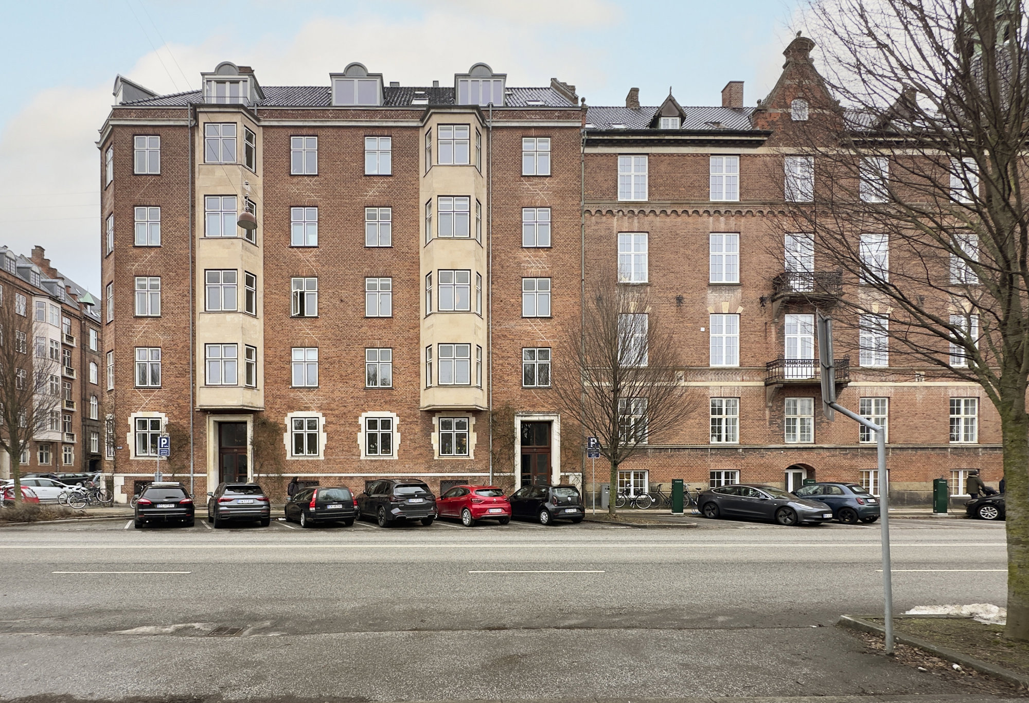 Ejendommen fra 1930’erne er mere underspillet end sine palælignende naboer, men solid og gennemtænkt med fokus på materialer, proportioner og ikke mindst lys. På 2. sal venter 128 kvadratmeter, der åbner sig i tre store stuer en suite, et værelse, et rummeligt badeværelse og et køkken med udgang til altan. Har man flere børn end værelser, kan man let inddrage både den forreste og bagerste stue til værelser. Lyset vælter bogstaveligt talt ind gennem karnappen og dannebrogsvinduerne; takket være de lavere bygninger overfor er udsigten over træer og hustage ganske uforstyrret, og man får en fornemmelse af at være højere oppe, end knappen i opgangens elevator indikerer. Lejligheden er løbende istandsat med respekt for arkitekturen, med snedkerbyggede radiatorskjulere og garderober og et enkelt og stilrent køkken og bad. Altanen vender ud mod en frodig gårdhave, som et engageret gårdlaug sørger for at holde grøn og indbydende.