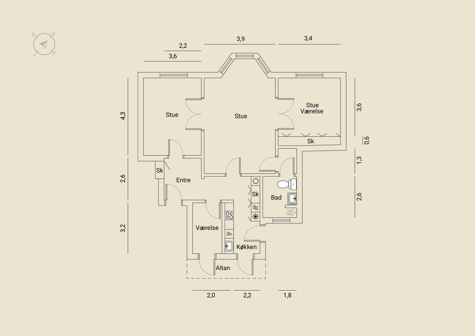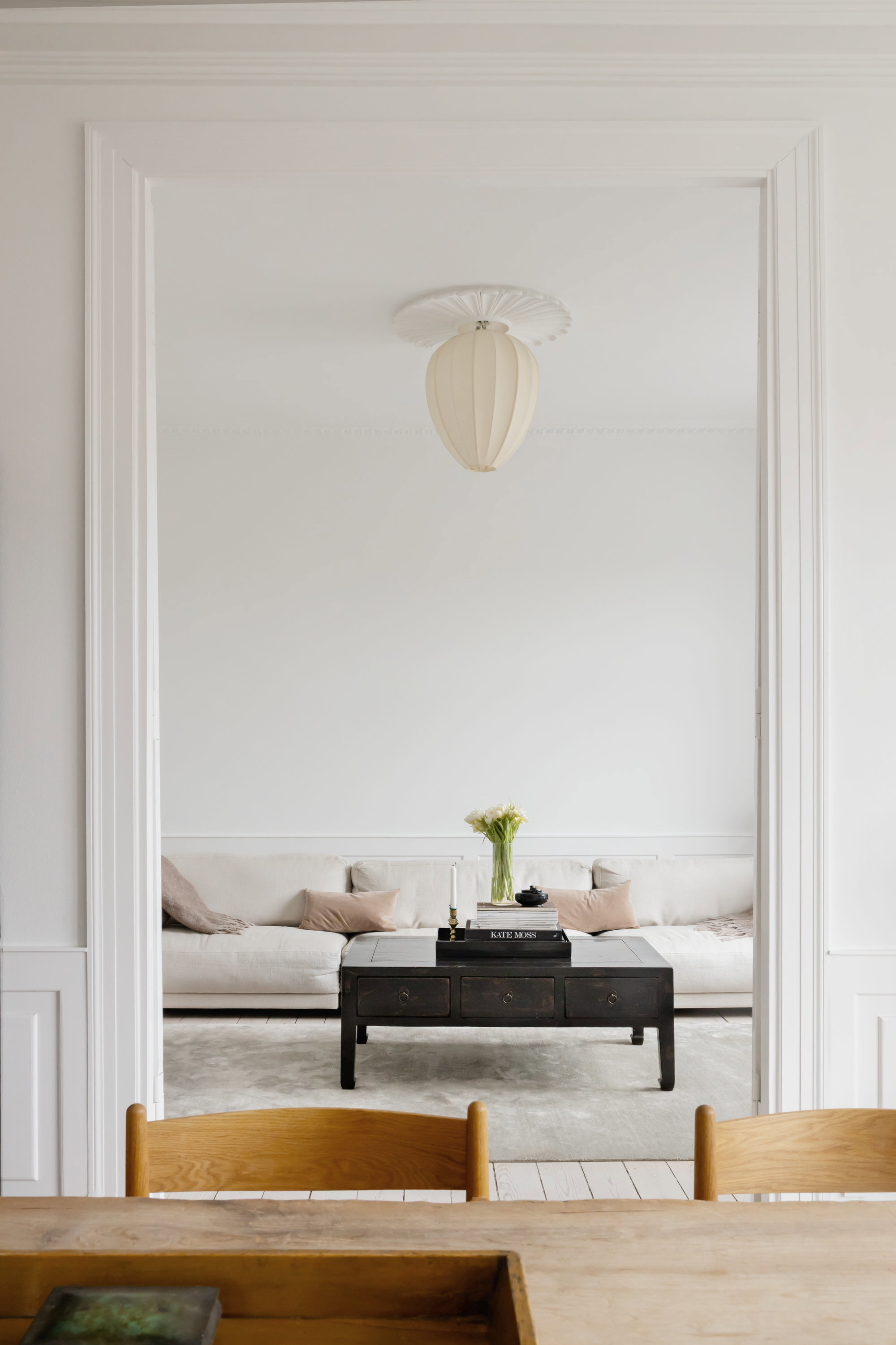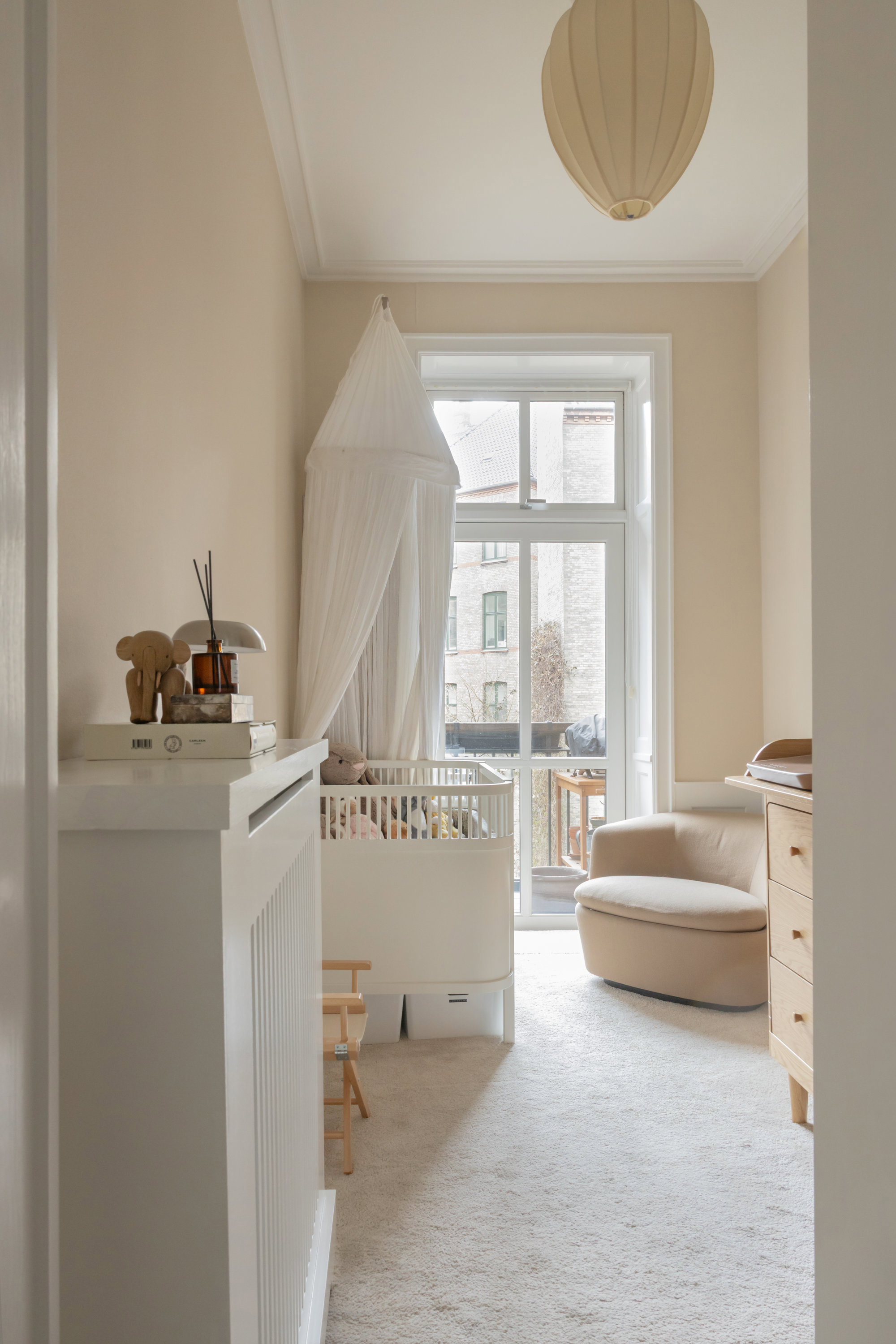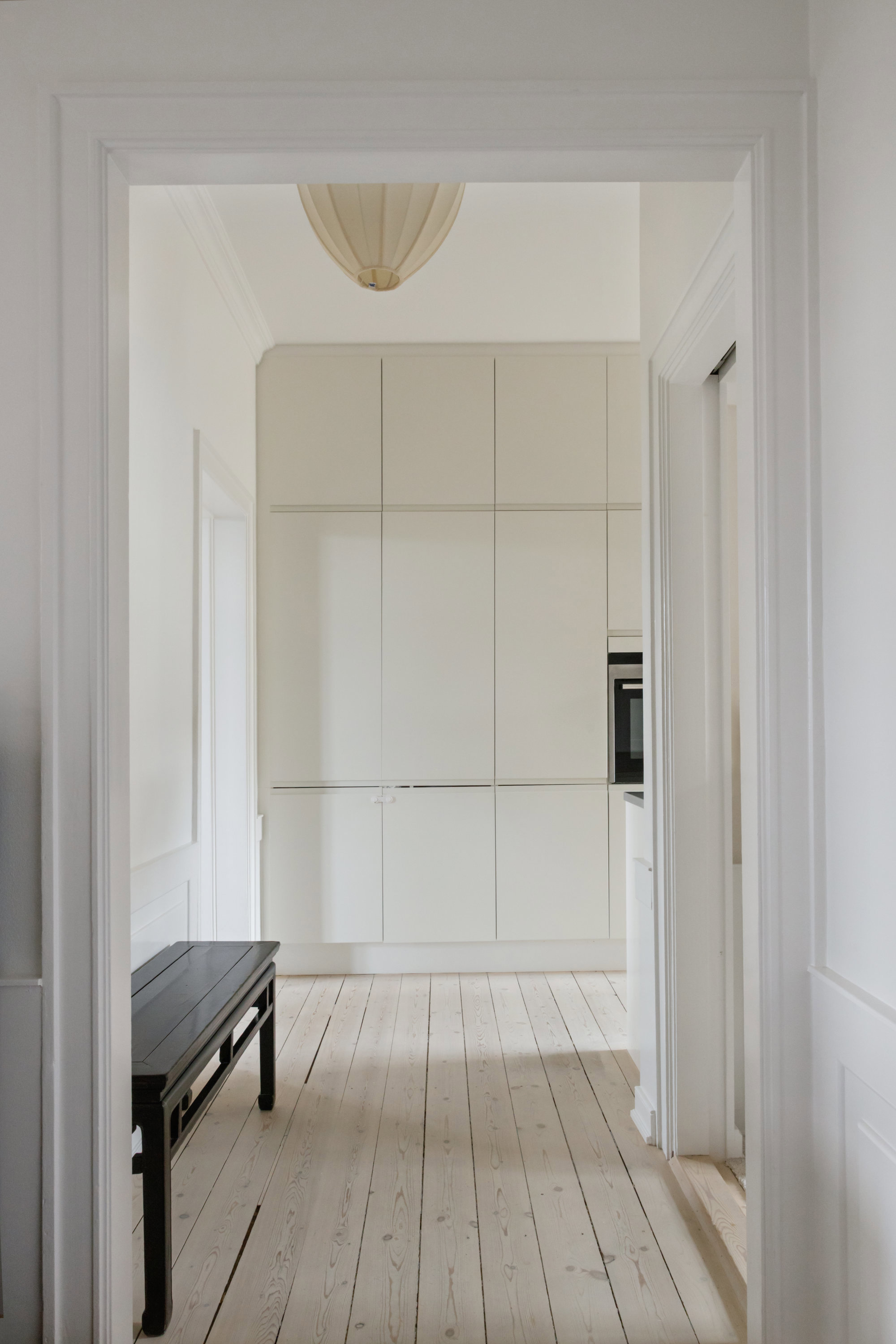 Ejendommen fra 1930’erne er mere underspillet end sine palælignende naboer, men solid og gennemtænkt med fokus på materialer, proportioner og ikke mindst lys. På 2. sal venter 128 kvadratmeter, der åbner sig i tre store stuer en suite, et værelse, et rummeligt badeværelse og et køkken med udgang til altan. Har man flere børn end værelser, kan man let inddrage både den forreste og bagerste stue til værelser. Lyset vælter bogstaveligt talt ind gennem karnappen og dannebrogsvinduerne; takket være de lavere bygninger overfor er udsigten over træer og hustage ganske uforstyrret, og man får en fornemmelse af at være højere oppe, end knappen i opgangens elevator indikerer. Lejligheden er løbende istandsat med respekt for arkitekturen, med snedkerbyggede radiatorskjulere og garderober og et enkelt og stilrent køkken og bad. Altanen vender ud mod en frodig gårdhave, som et engageret gårdlaug sørger for at holde grøn og indbydende.